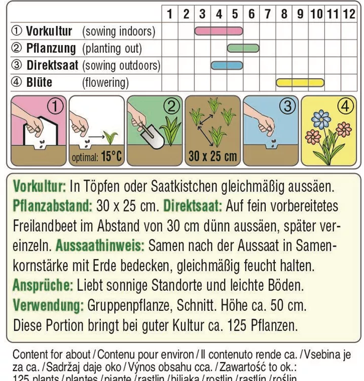 Liebt sonnige Standorte und leichte Böden. Die gefüllten Blüten leuchten in Gelb- und Orangetönen. Sie können als Gruppenpflanze und für den Schnitt verwendet werden (Höhe: ca. 50 cm).