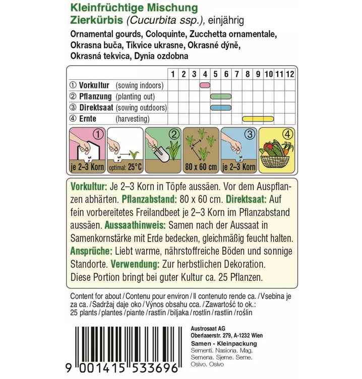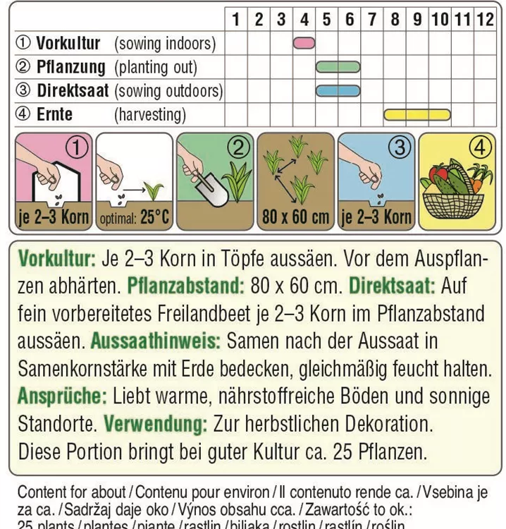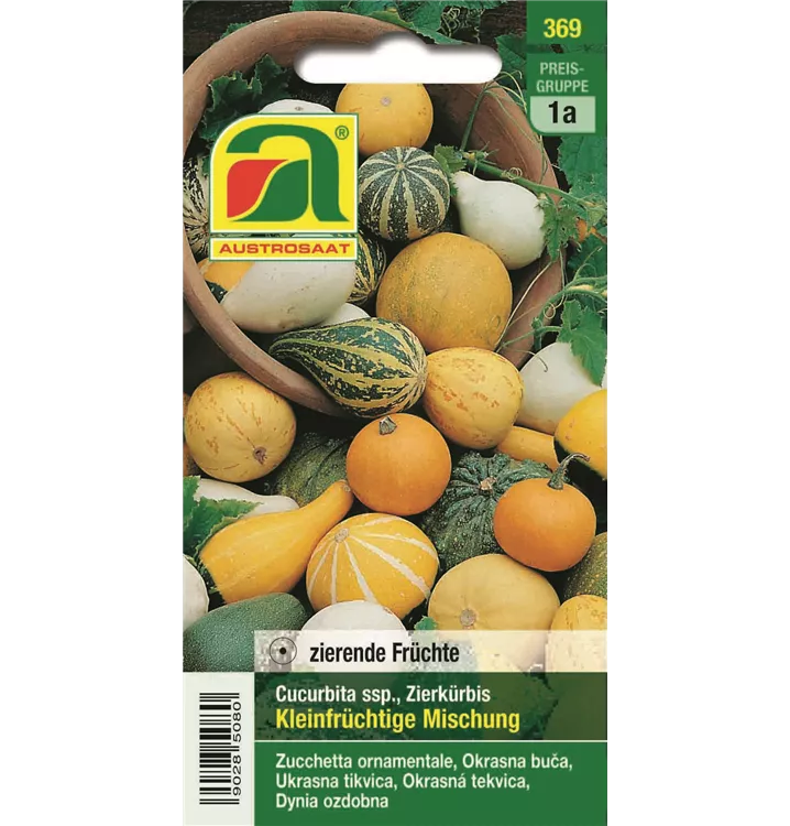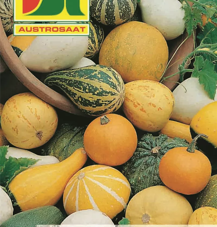 Eine Mischung aus Mini-Kürbissen, die verschiedene Farben, Formen und warzige oder glatte Schalen haben. Zierkürbis liebt warme, nährstoffreiche Böden und sonnige Standorte.