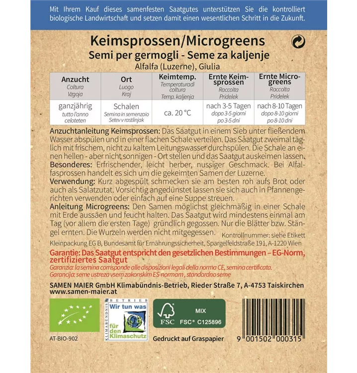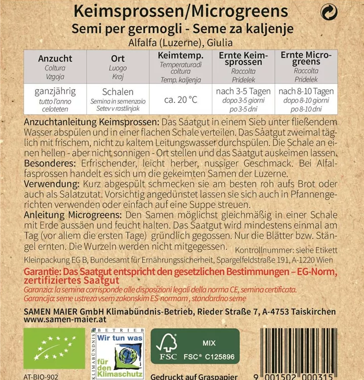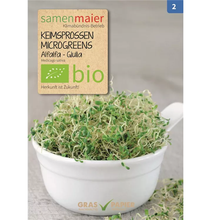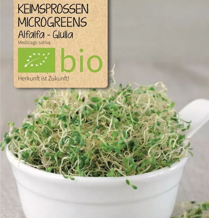 Anzuchtanleitung Keimsprossen: Das Saatgut in einem Sieb unter fließendem Wasser abspu¨len und in einer flachen Schale verteilen. Das Saatgut zweimal täglich mit frischem, nicht zu kaltem Leitungswasser durchspu¨len. Die Schale an einen hellen - aber nicht sonnigen - Ort stellen und das Saatgut auskeimen lassen. Besonderes: Erfrischender, leicht herber, nussiger Geschmack. Bei Alfalfasprossen handelt es sich um die gekeimten Samen der Luzerne. Verwendung: Kurz abgespu¨lt schmecken sie am besten roh aufs Brot oder auch als Salatzutat. Vorsichtig angedu¨nstet lassen sie sich auch in Pfannengerichten verwenden oder einfach auf eine Suppe streuen. Anleitung Microgreens: Den Samen möglichst gleichmäßig in einer Schale mit Erde aussäen und feucht halten. Das Saatgut wird mindestens einmal am Tag (vor allem die ersten Tage) gru¨ndlich gegossen. Nur die Blätter bzw. Stängel ernten. Die Wurzeln werden nicht mitgegessen.
