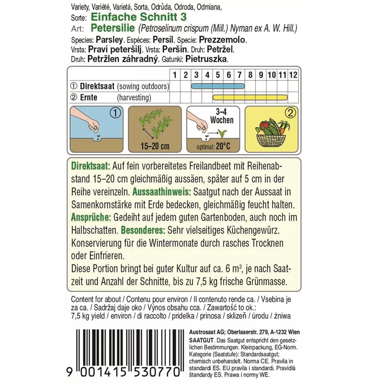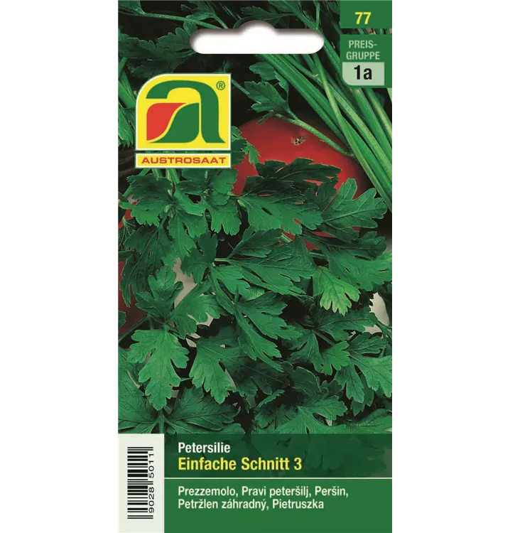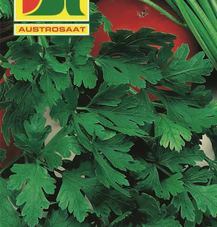 Eine dichtlaubige Schnittpetersilie mit glatten, dunkelgrünen Blättern mit typischen Aroma.