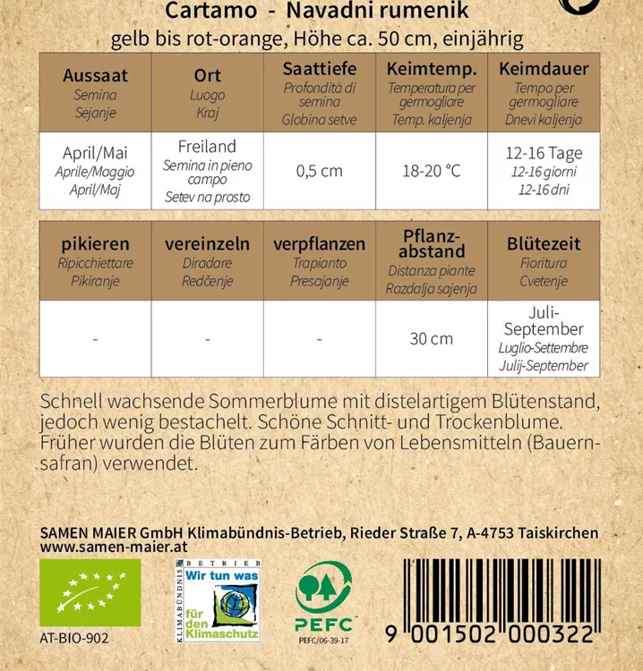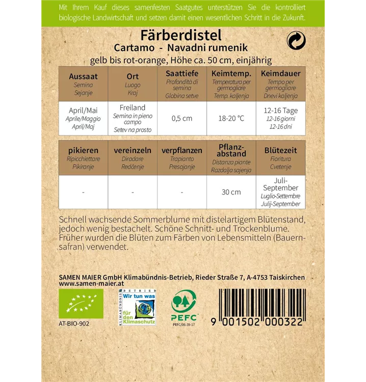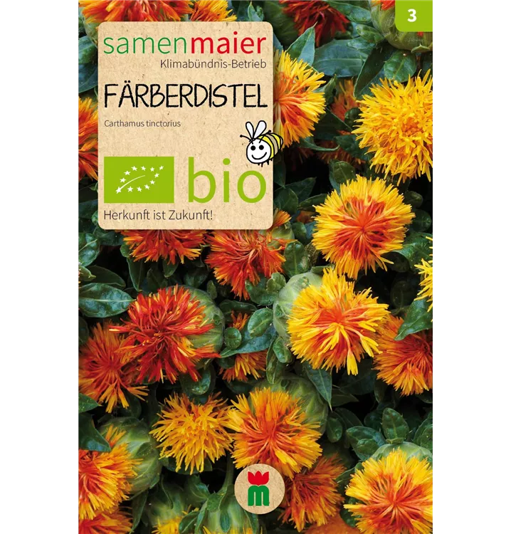Schnell wachsende Sommerblume mit distelartigem Blütenstand, jedoch wenig bestachelt. Schöne Schnitt- und Trockenblume. Früher wurden die Blüten zum Färben von Lebensmitteln (Bauernsafran) verwendet.
