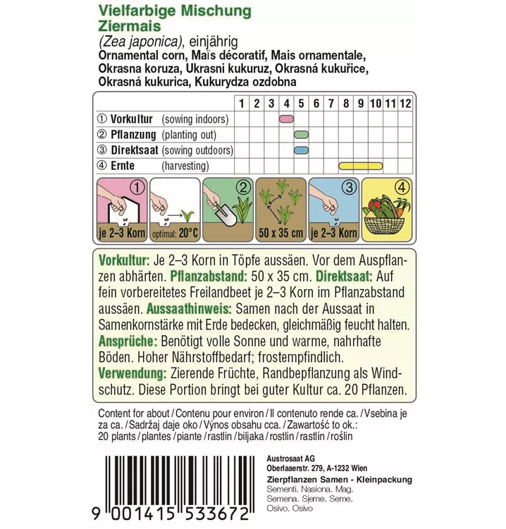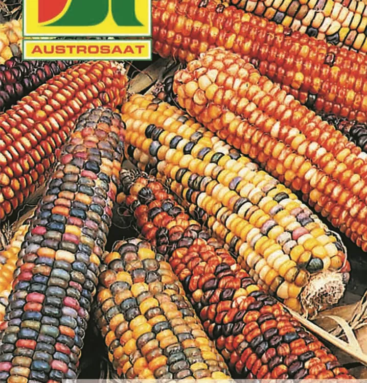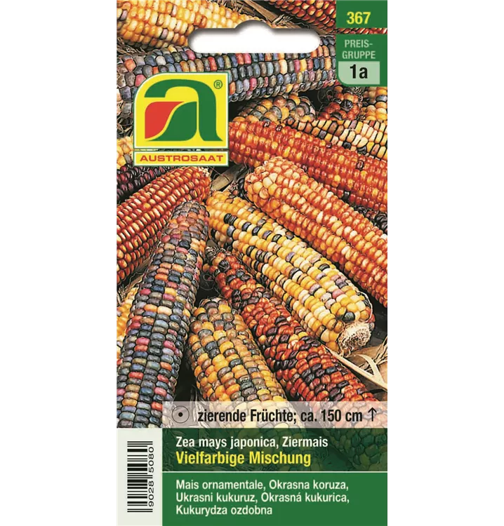Ziermais Vielfarbige Mischung bildet lange, große Kolben, die mit bunten Körnern besetzt sind. Die Farben reichen von Gelb- über Rot- bis hin zu dunklen Brauntönen. Er benötigt volle Sonne und nahrhafte, warme Böden. Die Wuchshöhe erreicht 150 cm.