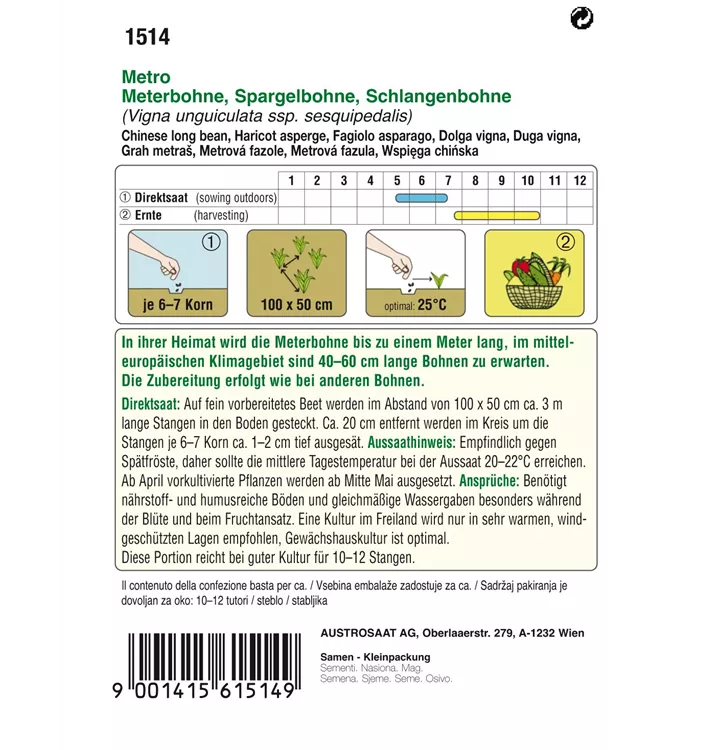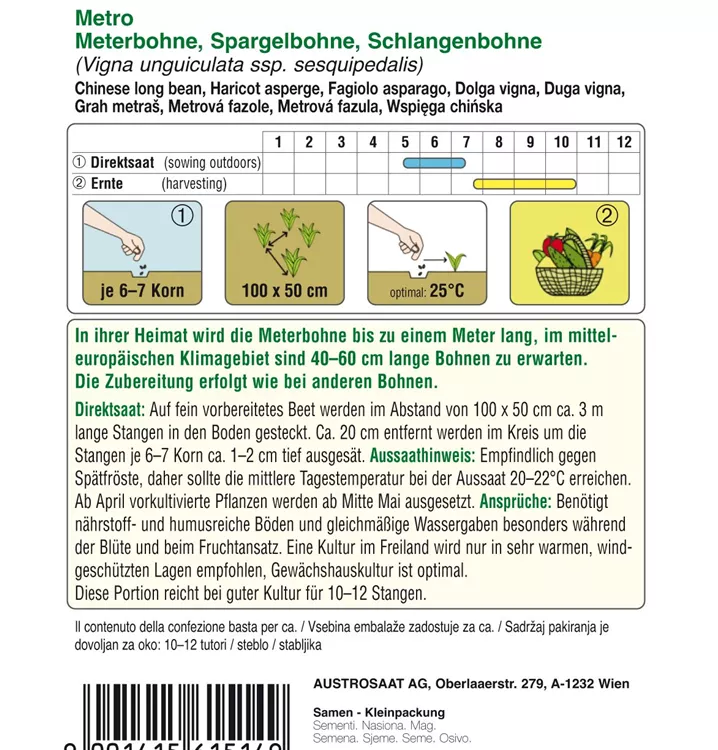In ihrer Heimat wird die Meterbohne bis zu einem Meter lang, im mittel-europäischen Klimagebiet sind 40-60 cm lange Bohnen zu erwarten. Die Zubereitung erfolgt wie bei anderen Bohnen.