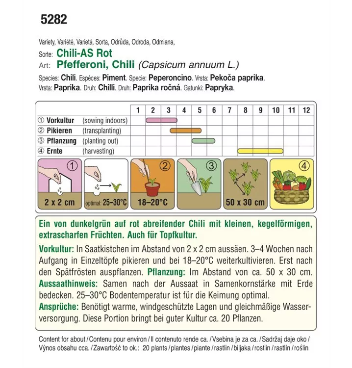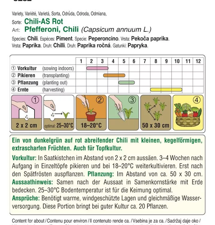 Ein von dunkelgrün auf rot abreifender Chili mit kleinen, kegelförmigen, extrascharfen Früchten. Auch für Topfkultur.