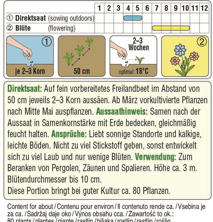 Trichterwinde Blauer Himmel hat große, trichterförmige Blüten in einem tiefen Blauton. Sie bevorzugt sonnige bis halbschattige und windgeschützte Standorte und kalkige, leichte Böden. Mit ihr können Pergolen, Zäune oder Spaliere bis zu 3 m Höhe berankt werden.