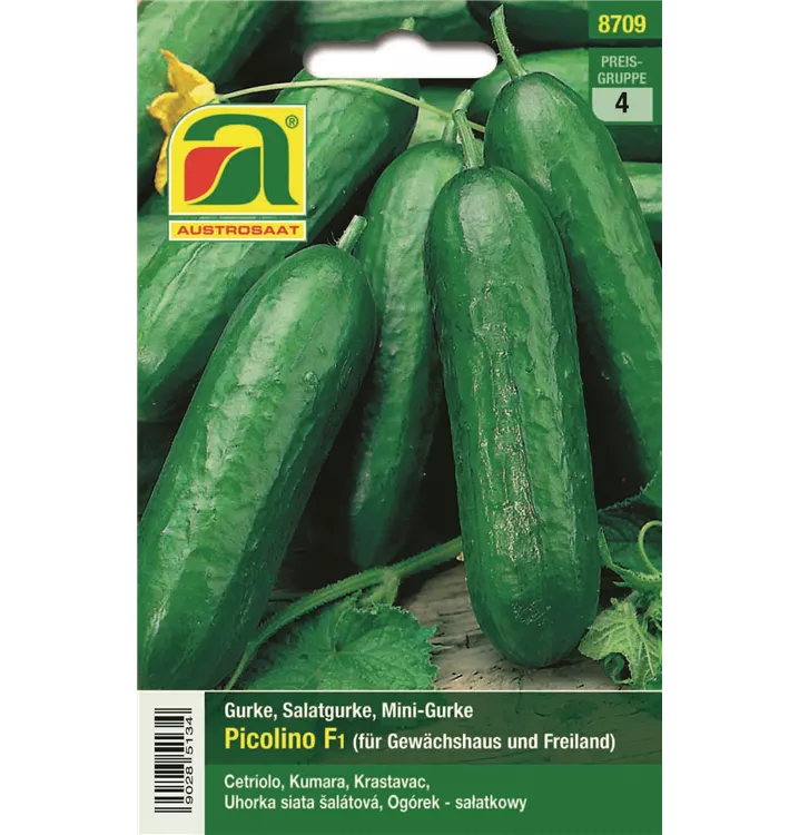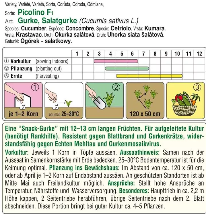 Eine "Snack-Gurke" mit 12-13 cm langen Früchten. Für aufgeleitete Kultur (benötigt Rankhilfe). Resistent gegen Blattbrand und Gurkenkrätze, widerstandsfähig gegen Echten Mehltau und Gurkenmosaikvirus.