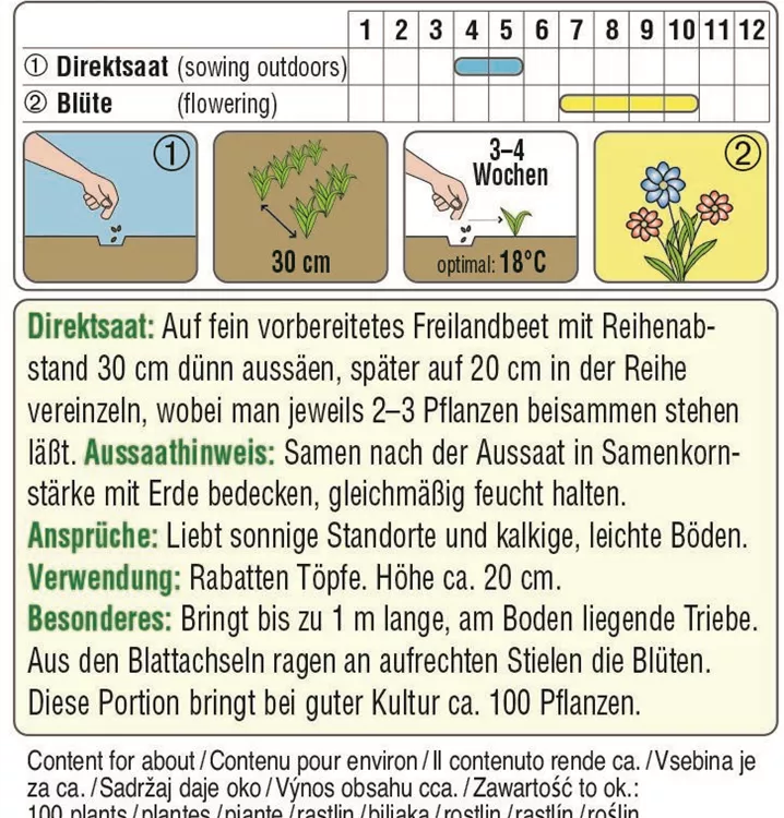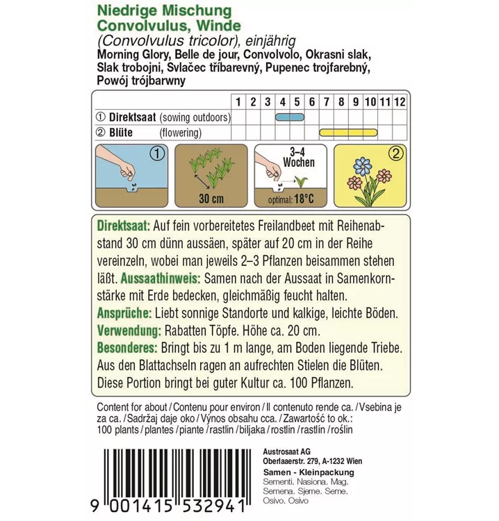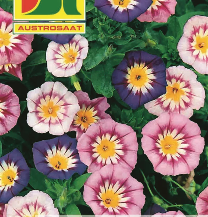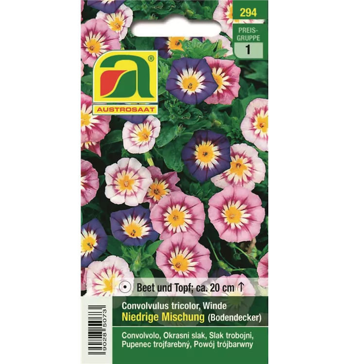 Winde Niedrige Dreifärbige Mischung hat bis zu 1 m lange, am Boden liegende Triebe. Die Blüten bilden sich in den Blattachseln und sind dreifarbig. Liebt sonnige Standorte und kalkige, leichte Böden.