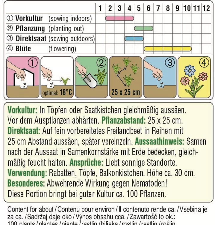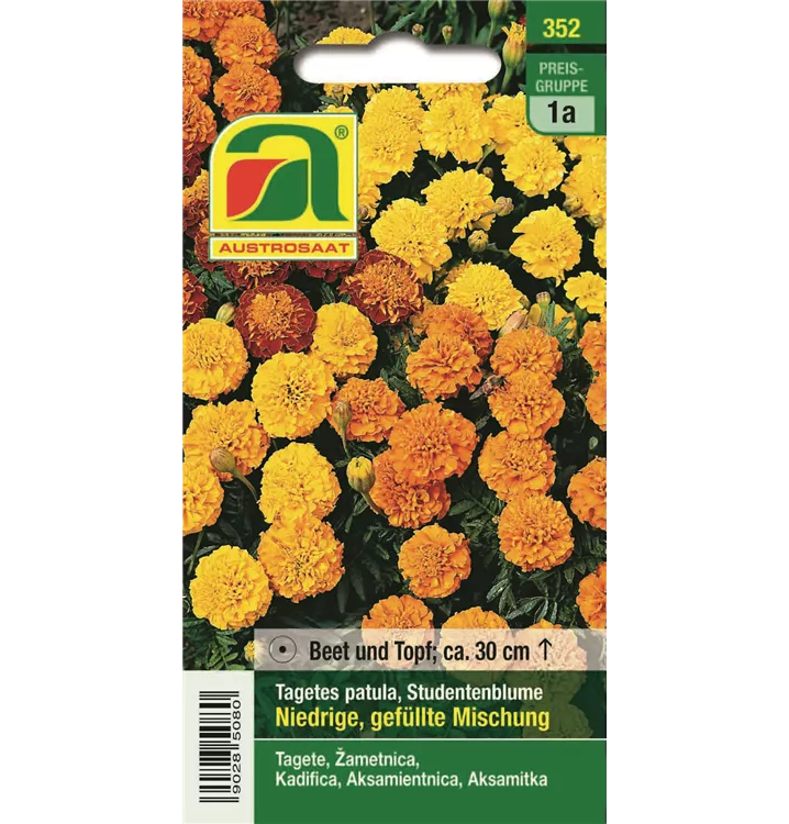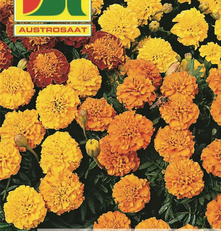 Tagetes Niedrige gefüllte Mischung, auch Studentenblume genannt, ist eine beliebte Beetpflanze mit einfach gefiederten Blättern und gefüllten Blüten. Sie liebt sonnige Standorte.