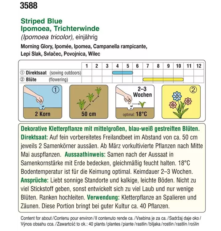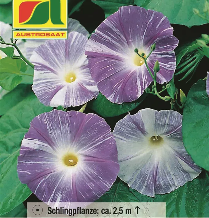 Dekorative Kletterpflanze mit mittelgroßen, blau-weiß gestreiften Blüten.