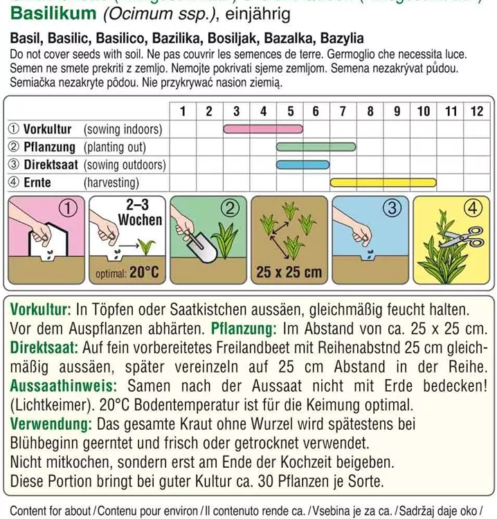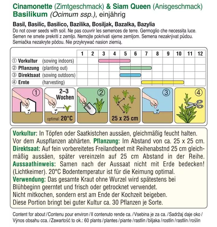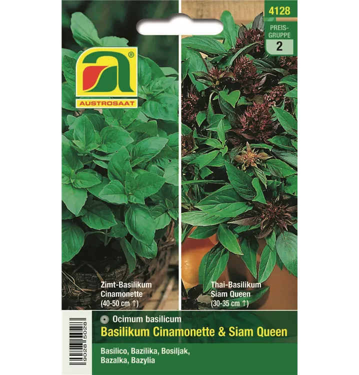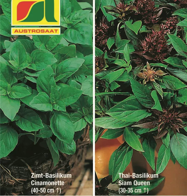 Basilikum Cinamonette & Siam Queen gehören zu den "Exotic-Basilikum". Cinamonette ist ein großblättriges Basilikum mit Zimt-Aroma und erreicht eine Höhe von ca. 45 cm; Siam Queen ist ein großblättriges Thai-Basilikum mit interessantem Geschmack zwischen Zimt und Anis, es erreicht eine Höhe von 30 -35 cm. Basilikum bevorzugt sonnige Standorte.