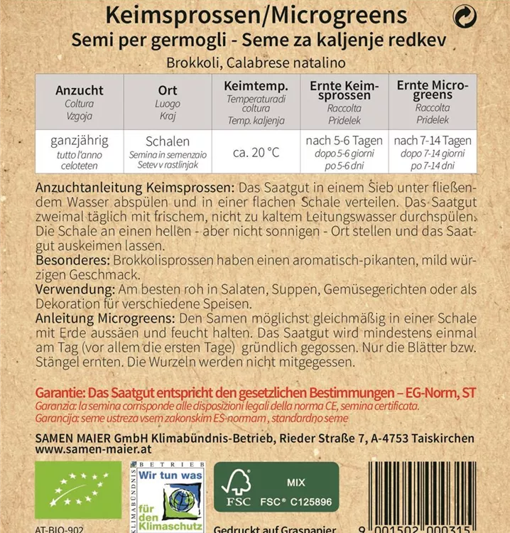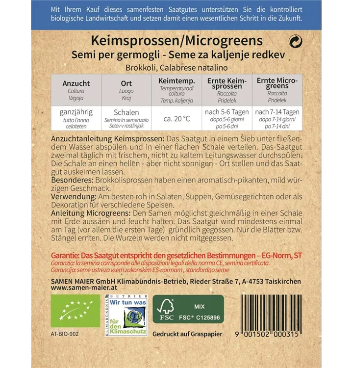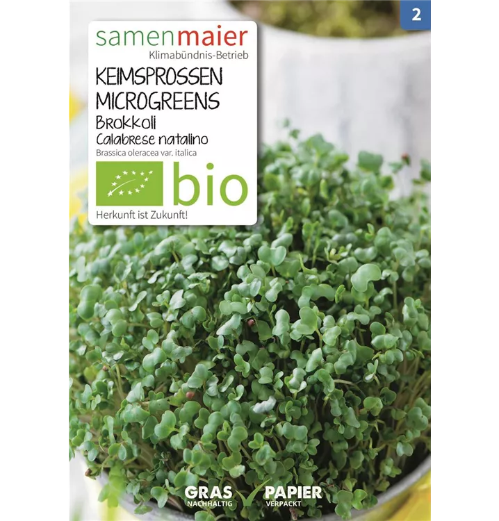 Anzuchtanleitung Keimsprossen: Das Saatgut in einem Sieb unter fließendem Wasser abspu¨len und in einer flachen Schale verteilen. Das Saatgut zweimal täglich mit frischem, nicht zu kaltem Leitungswasser durchspu¨len. Die Schale an einen hellen - aber nicht sonnigen - Ort stellen und das Saatgut auskeimen lassen. Besonderes: Brokkolisprossen haben einen aromatisch-pikanten, mild wu¨rzigen Geschmack. Verwendung: Am besten roh in Salaten, Suppen, Gemu¨segerichten oder als Dekoration fu¨r verschiedene Speisen. Anleitung Microgreens: Den Samen möglichst gleichmäßig in einer Schale mit Erde aussäen und feucht halten. Das Saatgut wird mindestens einmal am Tag (vor allem die ersten Tage) gru¨ndlich gegossen. Nur die Blätter bzw. Stängel ernten. Die Wurzeln werden nicht mitgegessen.