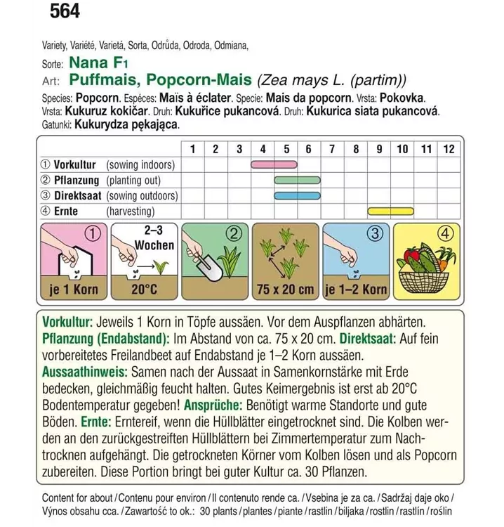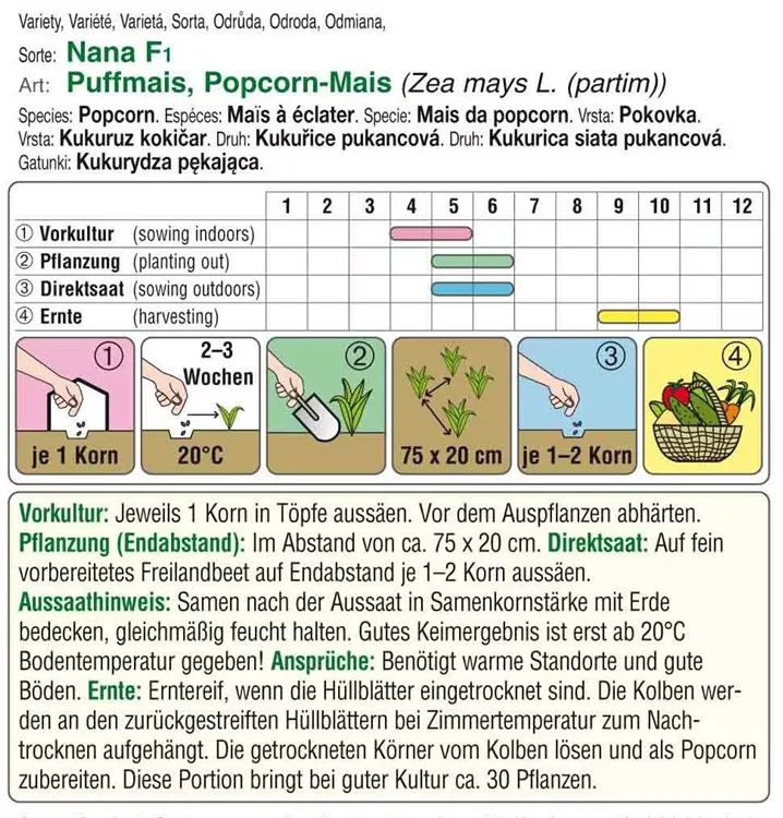 Eignet sich ideal zur Herstellung von Popcorn. Die Pflanzen sind standfest und ertragreich. Er benötigt warme Standorte und gute Böden.
