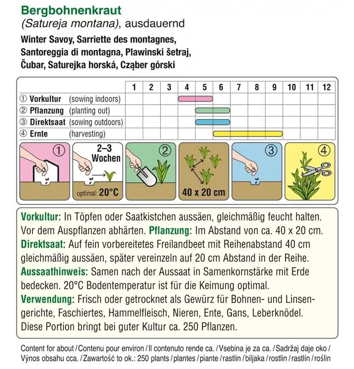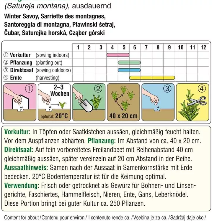 Auch Winterbohnenkraut genannt, zählt zu den mehrjährigen, winterharten Kräutern. Es kann frisch und getrocknet genutzt werden. Der Geschmack ist aromatisch scharf, pfeffrig. Es passt besonders gut zu allen Bohnengerichten, Faschiertem, Hammelfleisch, Nieren, Gans, Ente, Leberknödeln.