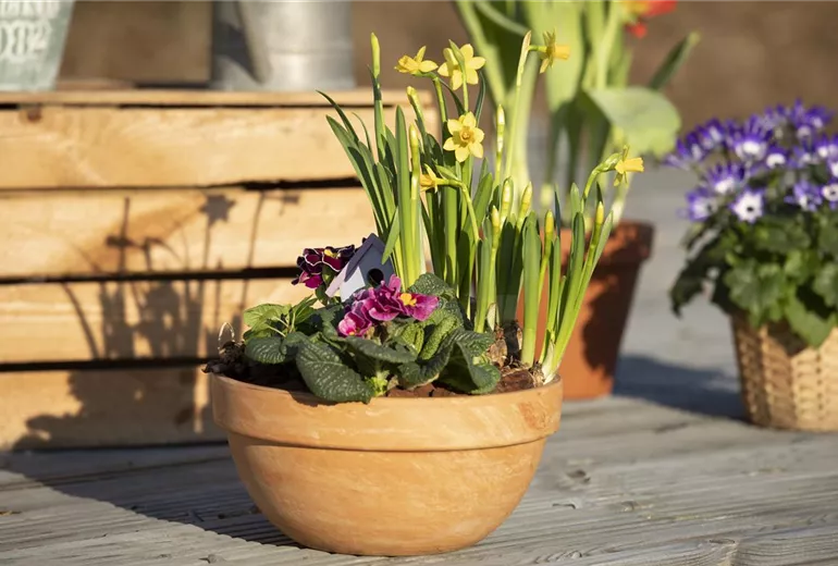 Narcissus cyclamineus 'Tête à Tête' In Pflanzschalen bieten sich unendliche Möglichkeiten. Fast alle Pflanzen lassen sich hier in hochwertiger Erde für eine gewisse Zeit gut halten. Erst wenn die Erde zu sehr verwurzelt, sollte man das Ganze erneuern. Sind kleine Büsche oder Bäume dabei (etwa Buchsbaum), muss dieser dann in den Garten, wenn er für ein oder zwei Jahre im Pflanzkübel war. Denn die Erdmenge und damit auch die Nährstoffe sind begrenzt.