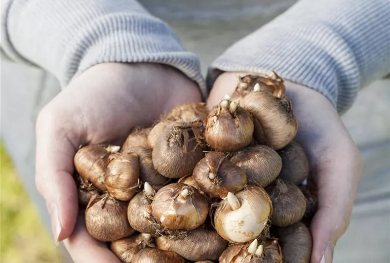 Wurden die Blumenzwiebeln nicht im Herbst gesetzt, muss man sie noch eine ganze Weile lagern. Bevor Sie also den Versuch starten, die Frühlingsblüher im Frühjahr zu setzen, prüfen Sie die Zwiebeln und Knollen genau. Haben sich zwischenzeitlich Schimmel oder Fäulnis gebildet, können sie nicht weiterverwendet werden. Sortieren Sie alle kranken Blumenzwiebeln aus. Mit den übrigen Zwiebeln sollten Sie sehr vorsichtig umgehen. Im Februar stehen die Blumenzwiebeln kurz vor ihrem natürlichen Austrieb. Deshalb ist der Zwiebelboden geschwollen und manchmal auch bereits die Triebspitze zu sehen. Beides darf beim Einpflanzen nicht verletzt werden.