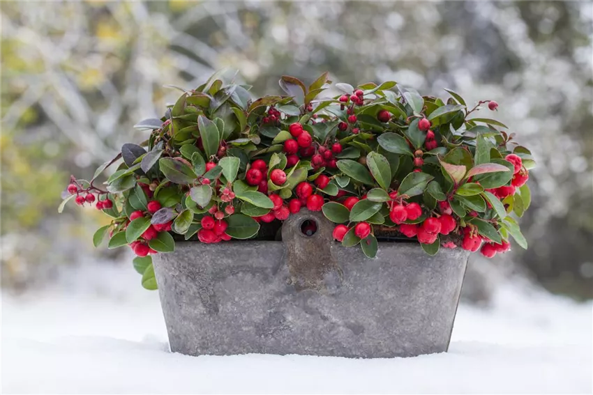Die Beeren der Scheinbeere bilden sich im Spätsommer aus, wenn aus den filigranen Kelchblüten kleine rote oder hellrosa Beeren werden. Eigentlich sind die Beeren aber wie zu erwarten gar keine Beeren. Es handelt sich um verdickte Kelchblätter, die eine dünnwandige Kapselfrucht mit einem giftigen Samen umhüllen. Scheinbeeren machen ihrem Namen also alle Ehre und sollte auf keinen Fall verzehrt werden. Schön anzusehen sind sie aber trotzdem! Und die immergrünen Blätter der Pflanze bringen die Beeren noch mehr zur Geltung.