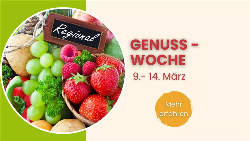 Feiern Sie mit uns die Genuss-Woche in unserem neuen Regionalmarkt! Von 9. bis 14. März dreht sich alles um regionale Qualität, ehrlichen Geschmack und die Menschen hinter den Produkten.
