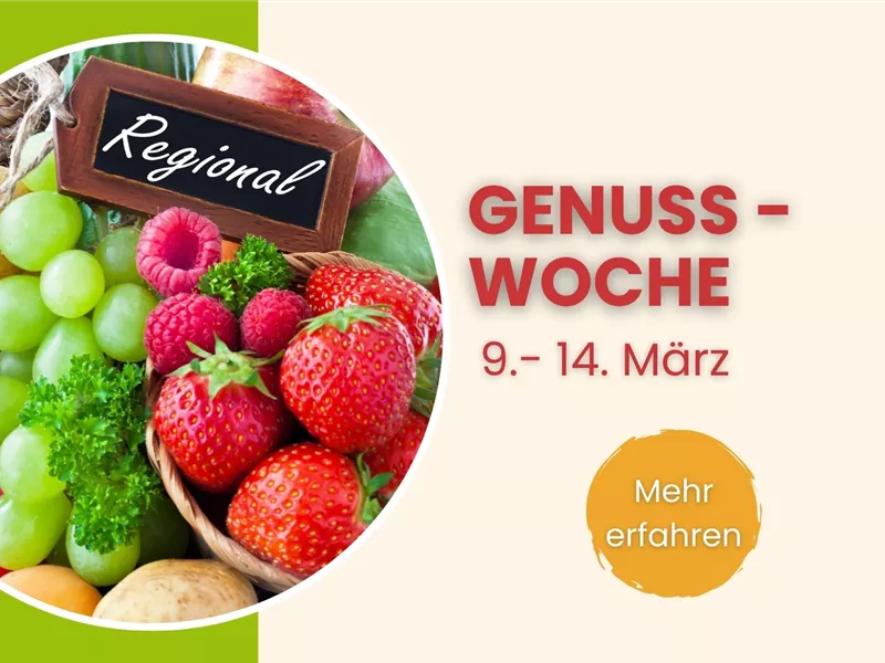 Schmökern Sie durch unseren neuen Regionalmarkt, probieren Sie besondere Gaumenfreuden, entdecken Sie liebevolle Geschenkideen – und lassen Sie sich während der Genuss-Woche von der Vielfalt und Qualität regionaler Produkte begeistern.